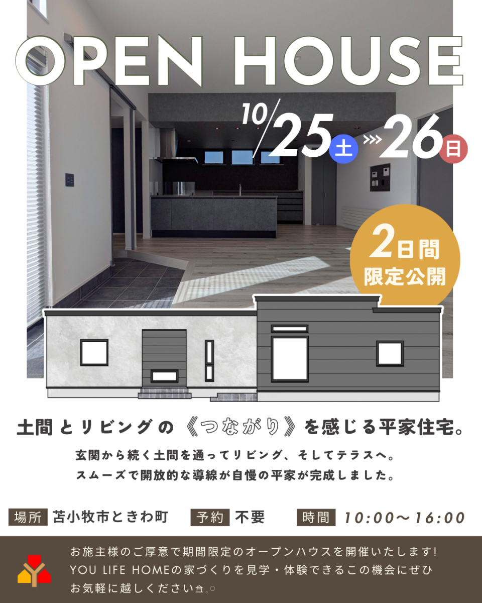 完成現場公開 🍀 土間とリビングのつながりを感じる平屋住宅